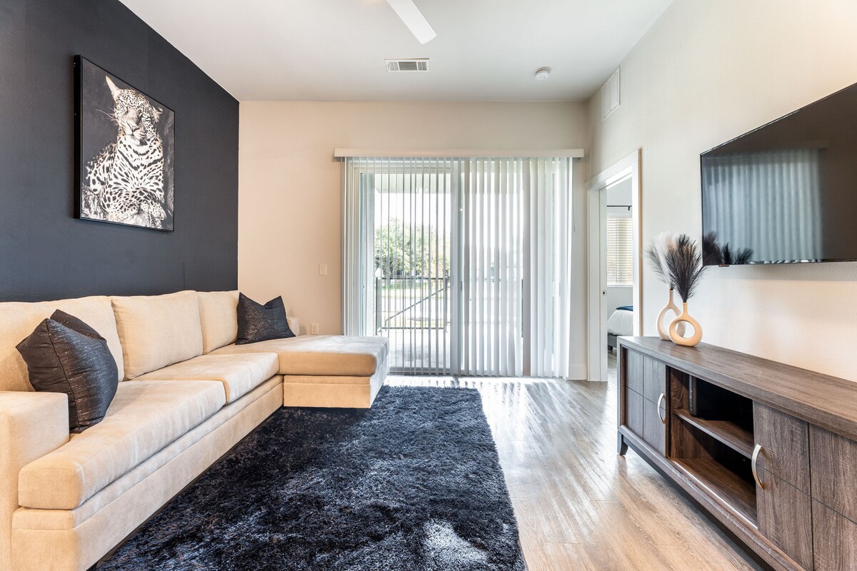 Peaceful yet centrally-located stylish, beautifully designed one-bedroom apt home with patio! Offers a blend of luxury and convenience, featuring: *Spacious Living Room *Open Floor Plan *Private Patio *Google Fiber Internet/WiFi *65" Smart TV *Spacious Kitchen *Stainless Steel Appliances *Large Comfy Queen Size Bed *HUGE Walk-In Closet *Washer & Dryer Inside Apartment *24/7 Fitness Center On Site *Resort-Style Pool And so much more! Perfect blend of luxury, comfort, and convenience!