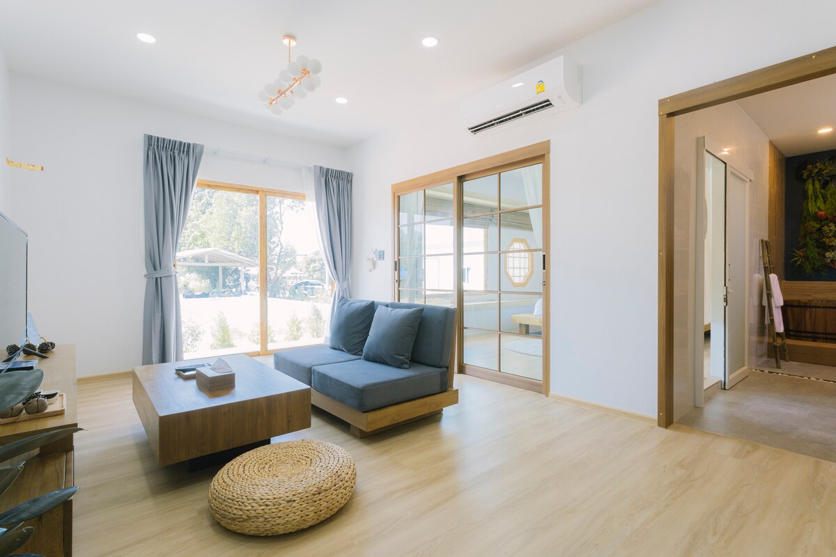 Moja vila ima površinu od 60 m2. Takođe smo VODILI TV , kablovsku TV, klima uređaj, sto za čaj, kuhinju u kojoj možete praviti hranu, kafu , specijalnu lampu za umetnike sa severa Tajlanda, pre nego što uđete imamo sistem kartica na našim vratima. Činim da moja vila ima osjećaj japanskog stila u prostoriji i kupatilu.
