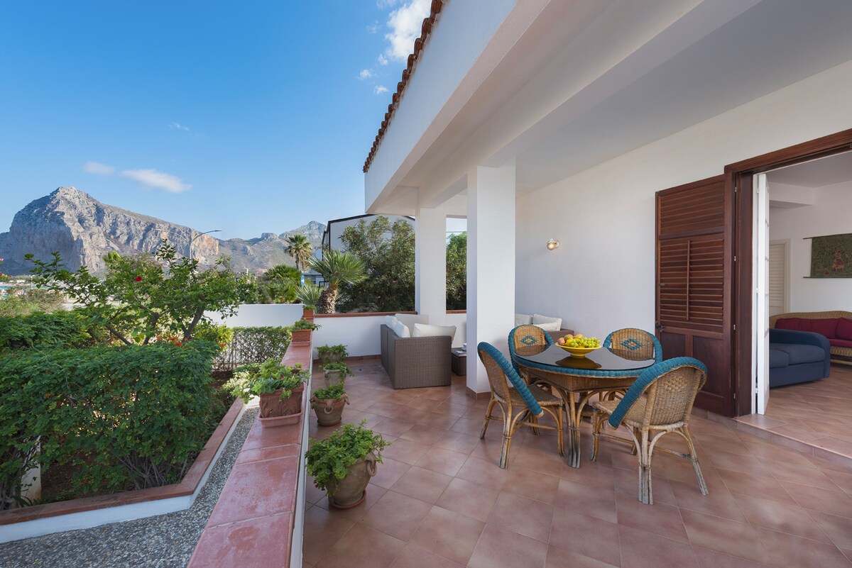 Nezavisna vila u sklopu rezidencije oko 1,5 km od sela i plaže. Mediteranski vrt je jak, velik, ekskluzivan i opremljen svime. Dvije velike terase. Kuhinja i vanjski tuš. Možete uživati u predivnom pogledu na Monte Cofano, Erice i Egadi. Kuća je opremljena svim udobnostima. Postoje dvije spavaće sobe: dvokrevetna i jedna s dva kreveta za jednu osobu, dnevni boravak s kaučem na razvlačenje i pametnim TV-om, klima uređaj, Wi-Fi, stolica za ljuljanje i roštilj.