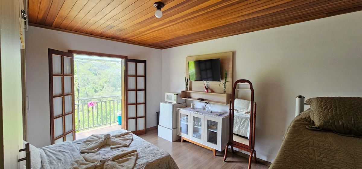 Confortável suíte/estúdio, 28 m2, com entrada independente da casa e linda vista. Espaçosa, acomoda confortavelmente até 4 pessoas. Conta com infraestrutura para o preparo de pequenas refeições. Roupa de cama e banho, além de cobertores e edredons, perfeitamente higienizados. Internet com fibra ótica de alta velocidade. Tv com 80 canais. Localizada no Alto do Capivari, cerca de 2km e meio, do centro turístico. Acesso fácil, com apenas 600mts em rua de terra batida, saindo do asfalto.