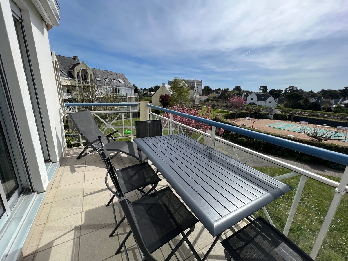 Ovaj stan površine 48 m2 ima privilegiranu lokaciju u odmaralištu La Baule. Smješten u zaštićenoj rezidenciji, u centru, av du Général de Gaulle, udaljen je 250 metara od plaže i 2 koraka od tržnice. Sastoji se od čajne kuhinje otvorene za svijetli dnevni boravak s balkonom, mirne spavaće sobe, terase okrenute prema jugu (mirno), ovaj stan će vam osigurati ugodan boravak! Povezani TV, Netflix, bb krevet, 1 otoman, garaža za bicikle, uključujući posteljinu.
