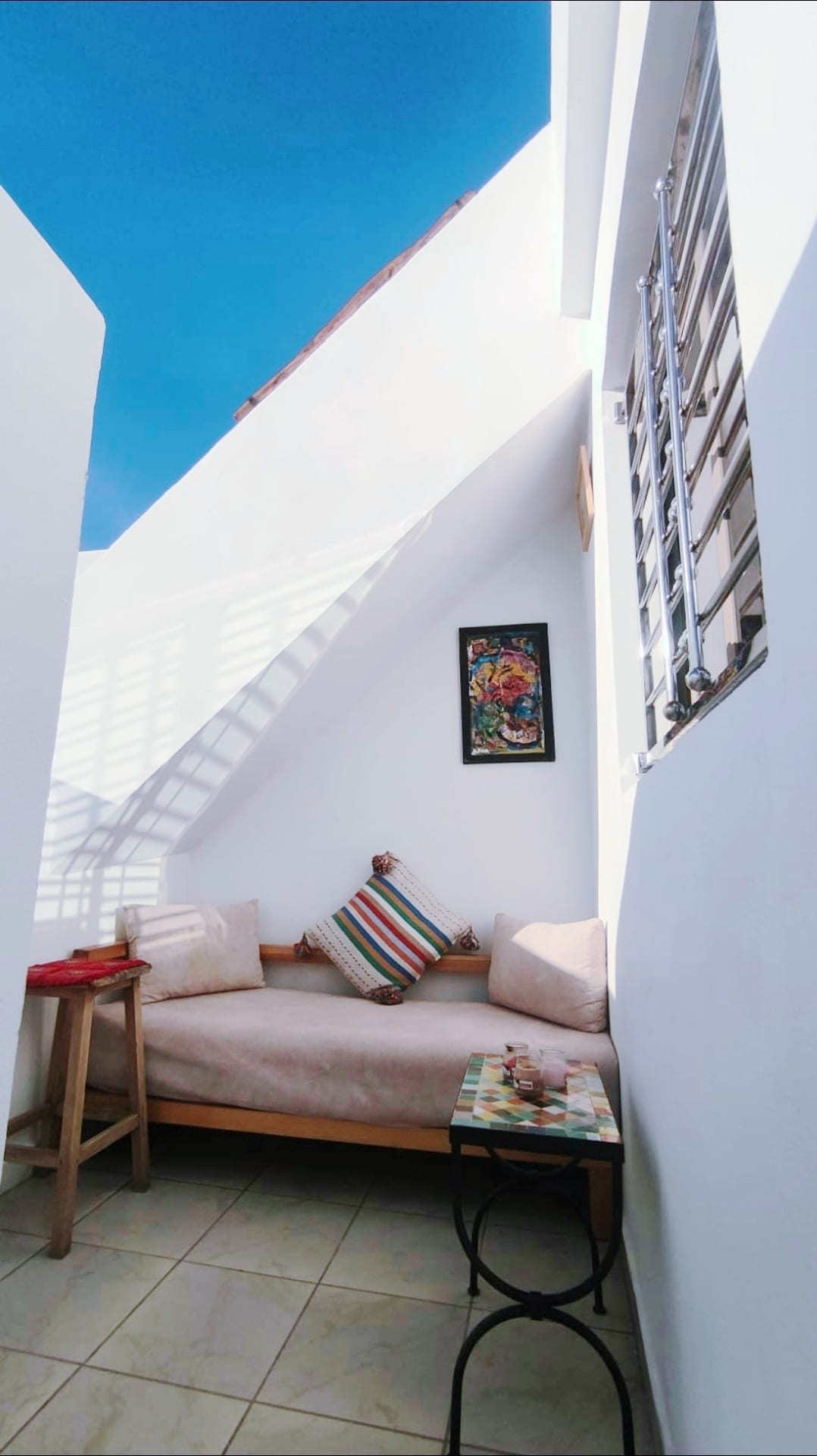 Vrlo svijetao studio bez vlage (vrlo rijedak u medini) od 47 m2 okrenut prema jugu, nalazi se u mirnoj uličici, u blizini glavne ulice. Studio se nalazi u blizini prodavnica, suka, kafića i restorana. S terase na krovu, okrenuta prema jugu, pruža pogled na plažu. Parking i automobilska stanica „supratours” (koja povezuje Essaouiru sa svim većim gradovima) udaljeni su 500 metara, kao i plaža i Place Moulay El Hassan. Savršen studio za par