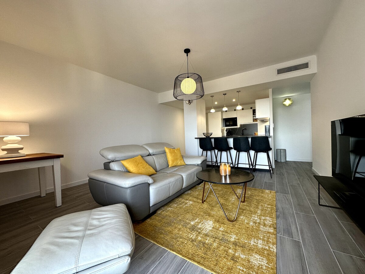 Stan tipa F2 s pogledom na more. 1 spavaća soba + novi i vrlo udoban kabriolet. Namještena kuhinja. Lift. Autobuska stanica u blizini. Besplatan parking. 5 minuta od plaže. Ulaz u grad, nedaleko od aerodroma (ali ne u prolazu aviona) i centra grada. Prodavnice u blizini. (Apoteka, pekara, ugostitelji...) registarski broj (2A0040001740F)