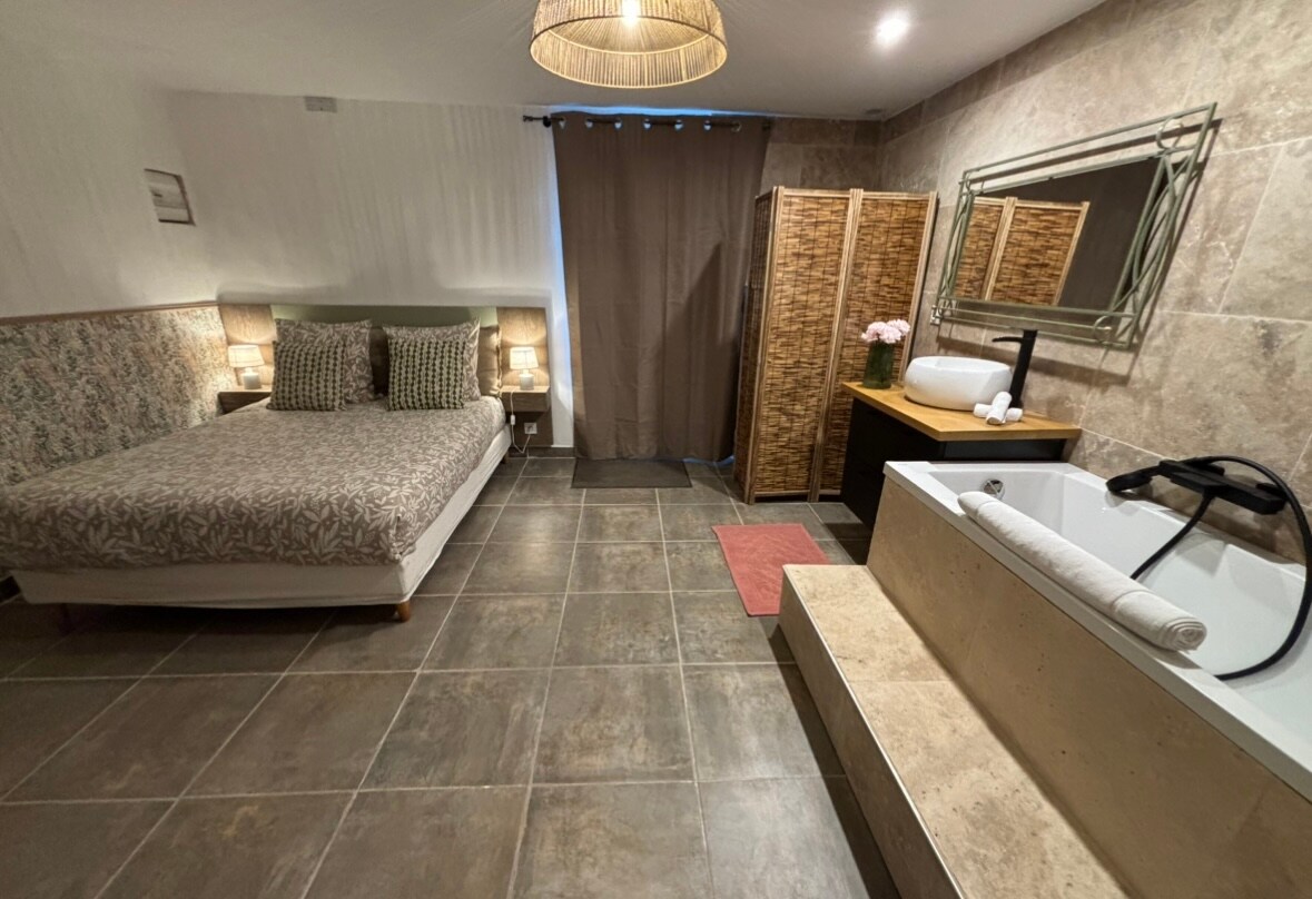 Seoske kućice na IMANJU „LA ROSE DES Vents” u CUGES LES PINS-U SMJEŠTENE SU u zelenom okruženju Seoska kućica od 45 m2 koja se sastoji od dnevne sobe s kaučem na razvlačenje, spavaće sobe s krevetom u 160 Velika privatna terasa površine 80 m² s ležaljkama i visećom mrežom, pogledom na dolinu Cuges I PRIVATNI SPA CENTAR U RADU TOKOM CIJELE GODINE. Zajednički teren za pétanque Privatni parking s nezavisnim pristupom giteu Uključene su posteljina, peškiri, čišćenje na kraju boravka, klima-uređaj i grijanje. Wi-Fi. Privatno pranje.