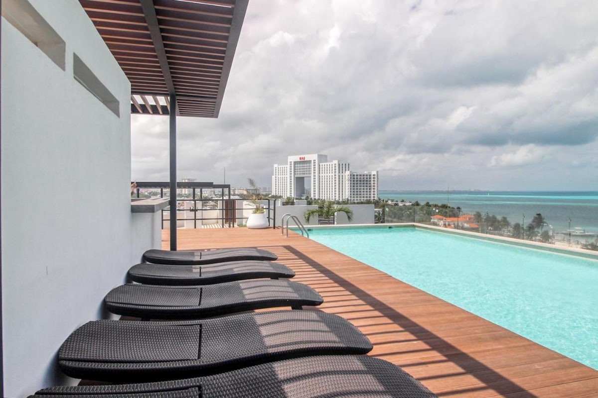 Stay in a beautiful top-floor efficiency unit with stunning lagoon views, new furniture, and modern amenities. Just one floor up, enjoy the rooftop infinity pool with 360° views of the Caribbean, Isla Mujeres, and the lagoon. Located on the northern side of Cancun's Hotel Zone, you’ll have quick access to beaches, public transport, shopping centers, amazing restaurants, convenience stores, and Cancún’s iconic nightlife.