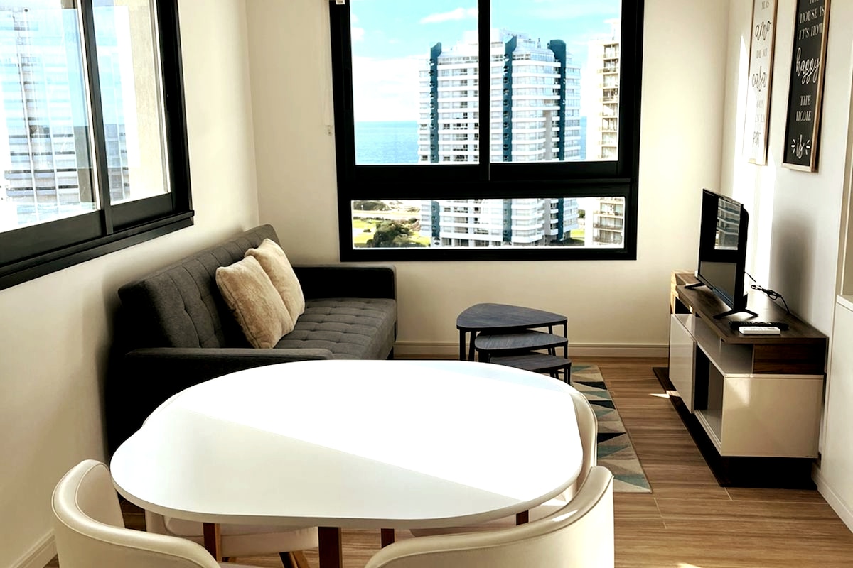 Moderno apartamento para 2 personas totalmente equipado con espectacular vista al mar y la península con 2 balcones, situado a cuadras del centro y de las playas mansa & brava. Incluye el uso de cochera propia, amenities de alta categoría como piscina interna y externa, sauna, gimnasio, business lounge y recepción atendida 24h. Ideal para relajarse y disfrutar de Punta del Este durante todo el año o combinar descanso y trabajo ya que dispone de una conexión rápida de internet (200 Mbps).
