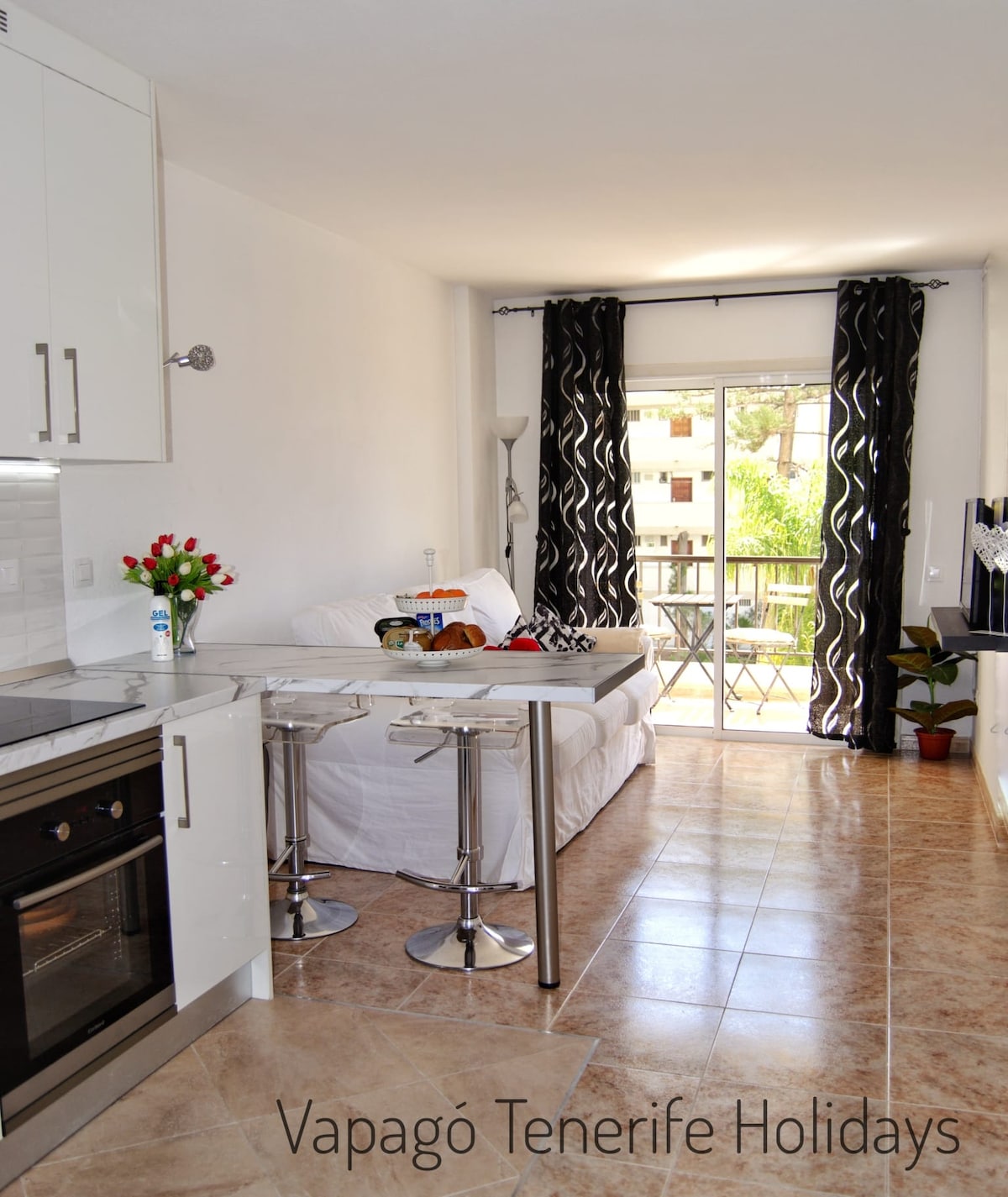 Disfruta del buen tiempo, tranquilidad y el ambiente de Los Cristianos en Tenerife Sur con amigos, con tú pareja, familia o como trabajador remoto. Wifi con fibra I Smart TV I Balcón I Ducha I Caffe Machine I Sofá-cama l Aire Acondicionado A 3 minutos de la Playa de Los Cristianos y del Muelle de Los Cristianos I 5 min Playa las Vistas I Parking privados a 2 min I 10 min Siam Park I 15 min Aeropuerto I 5 min Golf Las Américas I 10 min Monkey Park