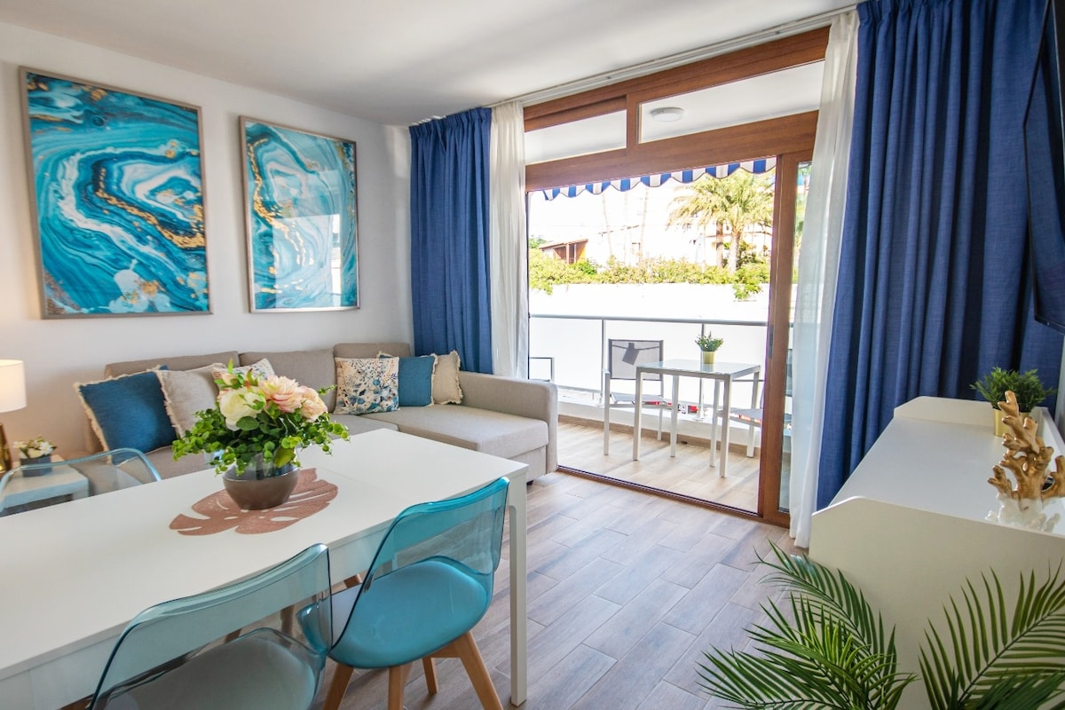 GALAXY Complete renovated modern and stylish apartment in the centre of Playa del Ingles (Maspalomas)/ swimming pool on site/ 10 minutes walk to beautiful sandy beach/ 3 minutes walk to "Yumbo" center/ air-condition with UV-C sterilization/ quin size bed 160x200 + comfortable sofa bed 140x200/ separate fully equipped kitchen with washer-dryer/ bathroom with shower/ workspace with fast internet/ HD TV + Netflix + Prime Video VERY COMFORTABLE :)