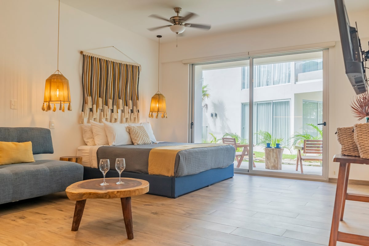 Spacious and comfortable Mexican colonial-style studio with fully equipped kitchen, 1 bathroom, satellite TV, and Wi-Fi. Relax in the cenote-style pool, enjoy another pool with palapa, chairs, and loungers, play on the tennis court, and take advantage of private beach access just 1 minute away. Perfect for couples, solo travelers, business travelers, or those seeking rest, combining comfort, exclusivity, and the best location in Playa del Carmen.