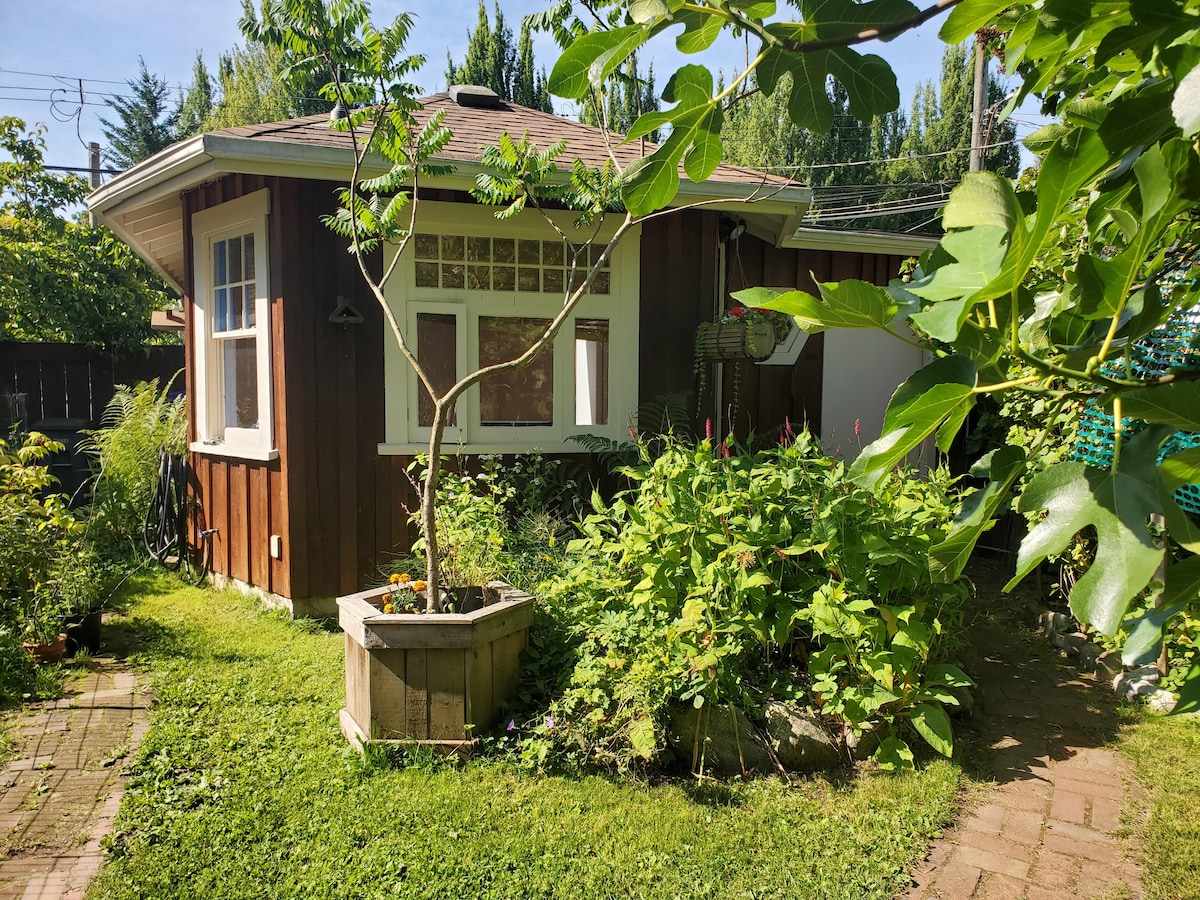 We are happy to welcome you to our quiet, friendly one room live/work studio tucked into an urban garden. Please spice up your dinner with herbs from the garden! We are located in East Vancouver and are a short walk from coffee shops and restaurants. FIFA games will be projected on a large screen at the PNE a seven minute walk away. We are about 45 min. from YVR and 20 min. to the Alaska cruise terminal. Easy access to bicycle routes, the North Shore mountains, Whistler and BC's Interior.