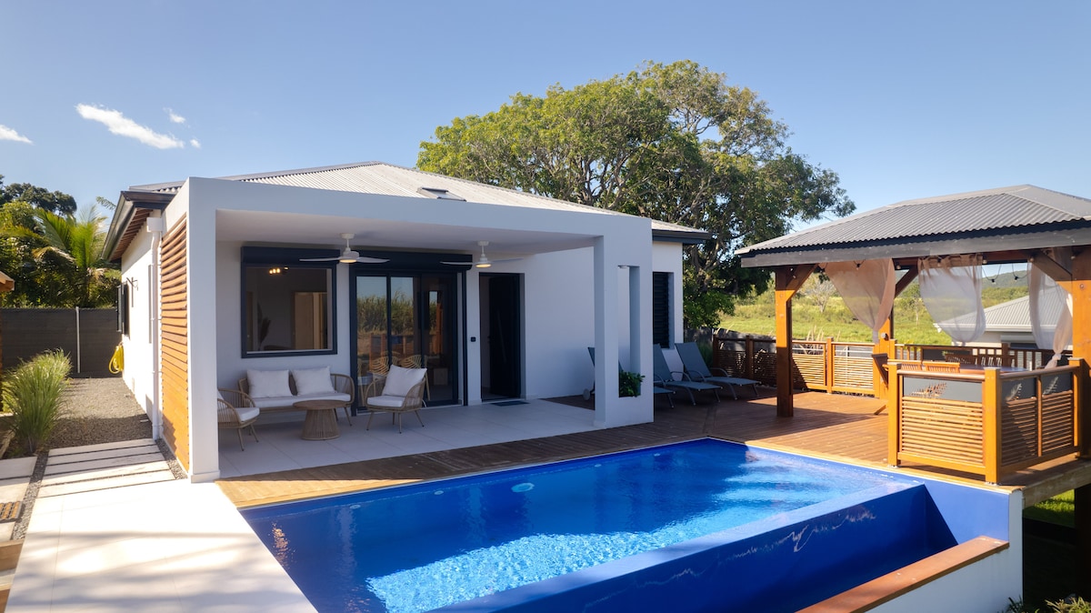 Kreolska kuća je potpuno renovirana iz modernog ugla na početku 2023. godine. Zabavite se s cijelom porodicom u ovom elegantnom smještaju u blizini najljepše plaže Guadeloupe (50 m od plaže Nogent, 2 min vožnje od plaža Clugny, Almond i Pearl, 5 minuta vožnje od najljepše plaže Guadeloupe: Grande Anse u Deshaieju). Vila se nalazi u tropskom parku s kraljevskim palmama uz more. Pogled na more dok ste u bazenu oduzima dah.
