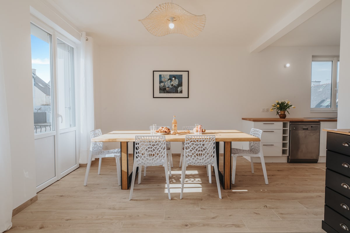 Dođite i odmorite se u ovom lijepom domu i prekrasnom području ♥ Pogled na more u Plougonvelinu Obalno ♥ selo sa svojim prodavnicama ♥ Njegove plaže i jedinstvena turistička mjesta Zatvoreni ♥ bazen (grijan na 27°) ( zatvoren od 4. novembra do 20. decembra 2024.) Uredan i topao♥ raspored ♥ Stopala u vodi, velika terasa 180° s pogledom na more, okrenuta prema plaži ♥ 4. i gornji sprat, ♥ Savršeno za otkrivanje Pays d 'Iroise, 30 minuta automobilom od Brest