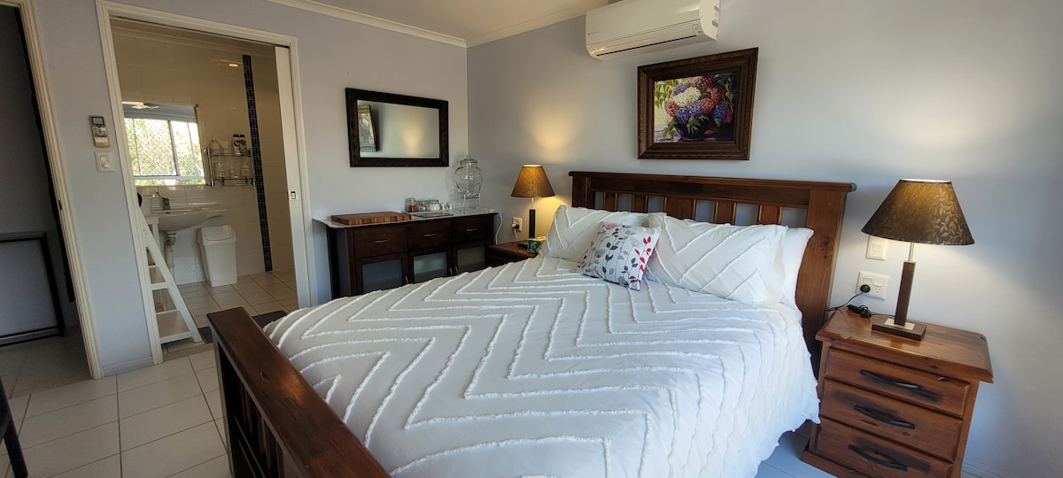 Welcome to our lovely, fully self-contained studio apartment — your own tropical sanctuary. Fresh and clean, the studio has everything you need for a comfortable and relaxing stay. The studio is located in the backyard of our home, converted to host guests. You’ll enjoy a private entrance and your own peaceful space, separate from the main house. Step outside to a tranquil deck, perfect for enjoying a cuppa or an evening glass of wine. 🚭 Please note: This is a non-smoking property.