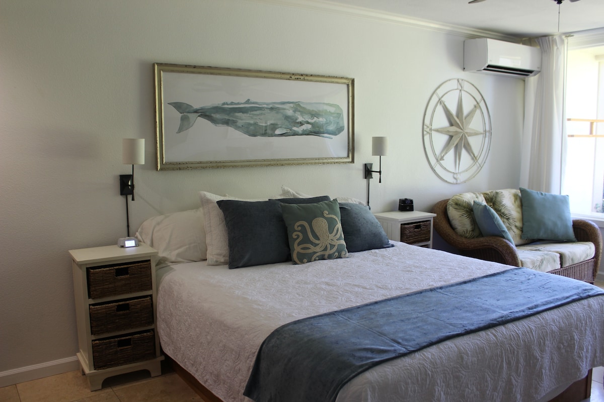 Direct OCEANFRONT/BEACH Charming Oceanfront studio. Surrounded by enchanting tropical Gardens. Location is central to the entire island. Walking distance to restaurants, shops, and the best walking beaches on the island. One of the very few completely updated condos. Best of all, it's a few steps to the sand. The only views are of the ocean, the beach, and the gardens; there is no railing obstructing them. Enjoy the sunrise with a cup of coffee or a glass of wine after a day of sightseeing.