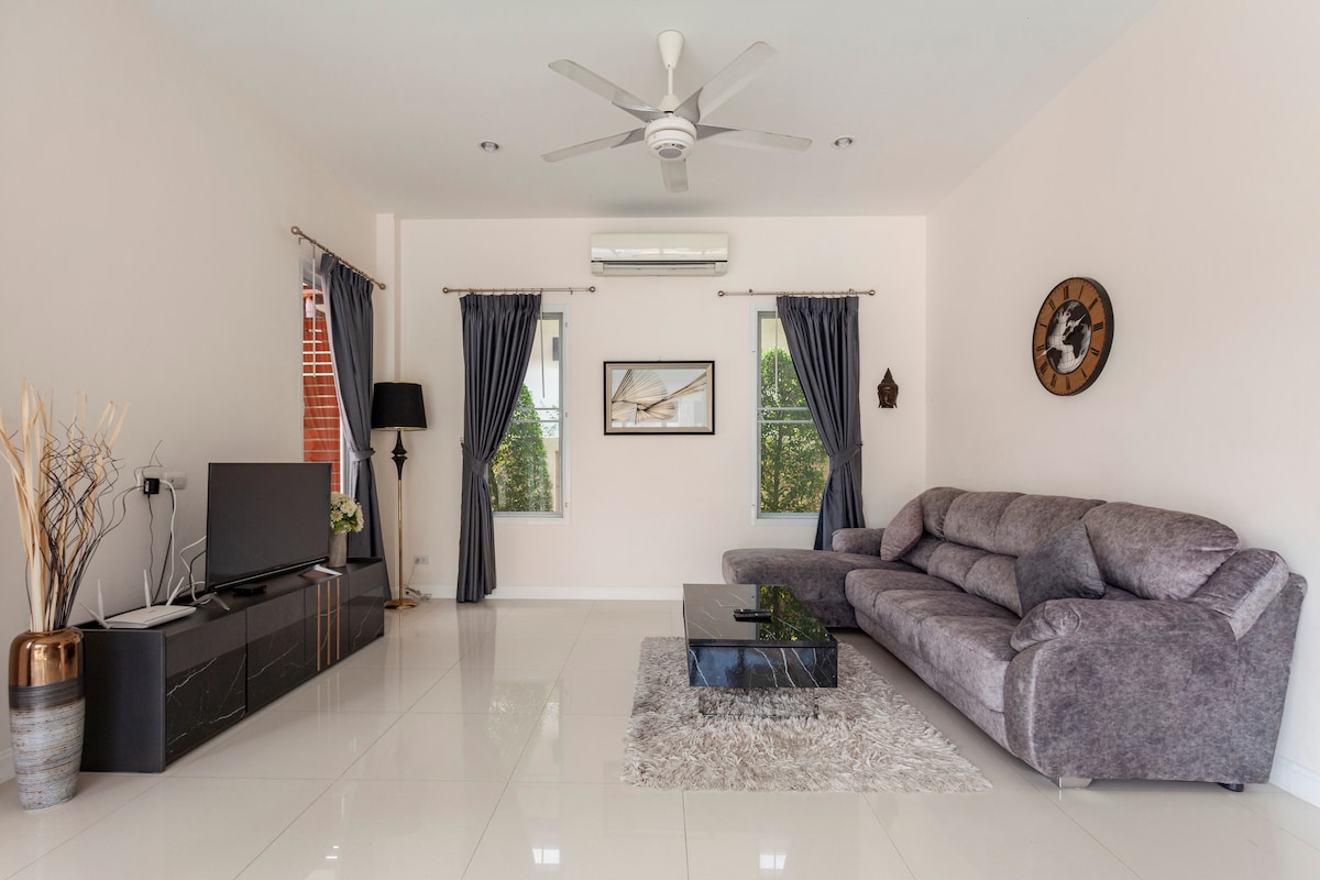 🌴 Your private pool villa getaway, near Siam Country Club.🏌♀️ -3 bedrooms 3 bathrooms (2 King, 2 Twin) -Utilities included -Private Pool -Pool cleaning (2x a week) -WIFI (Hi speed) -Smart TVs (living 65"/master 55") -Board Games & Karaoke -BBQ grill -Equipped Kitchen -Blackout curtains -Washer/Dryer -Fresh Towels -Shampoo/Conditioner/Soap -25 min. drive to Jomtien Beach ❤️ Perfect for family vacation, nature-lovers, quiet nights, & longer stay. ⭐️SPECIAL Weekly & Monthly price Book now❗️