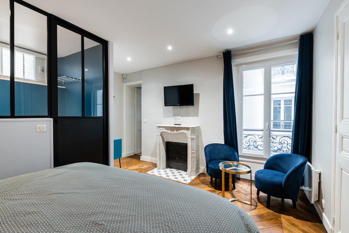 Architect design 2 room apartment, Safest and most luxurious area of Paris 7th facing a one star Michelin restaurant. Shops, museums, Eiffel Tower, Invalides, Alexandre III bridge, Seine river. Super Quiet, classy, safe Parisian building. One bedroom, chimneys and desk, luxury bed & bedlinen, Italian design bathroom, living room, stylish sofa, chimney, Ultra high speed WIFI, tv 900 channels, luxury kitchen. Wooden floor, mirrors. Double-glazing windows. Air Conditioning +air purifier