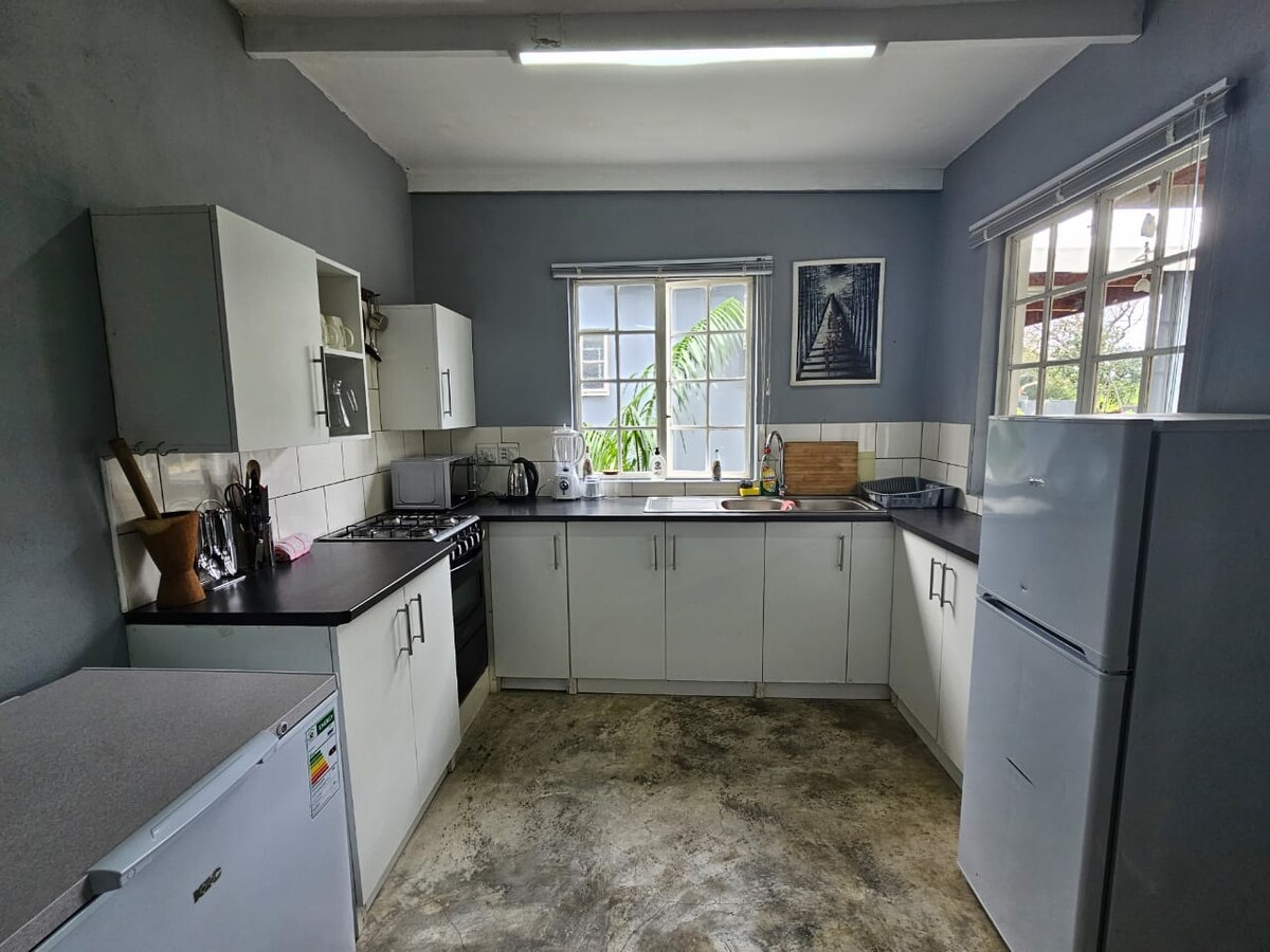 Sve 4 spavaće sobe imaju privatna kupatila i stropne ventilatore. 2 spavaće sobe imaju XL krevete, 3. spavaća soba ima 3 kreveta za jednu osobu, a 4. spavaća soba ima bračni krevet XL i krevet na izvlačenje za dijete. Neograničen STARLINK WI-FI - streaming TV-a i potpuno opremljena kuhinja s ledomatom i mašinom za pranje veša. Sigurno u glavnoj spavaćoj sobi. Privatni bazen, naslonjači i viseće ležaljke. Braai područje na osami. Sigurnost 0-24, dnevna usluga čišćenja. Kratka šetnja do restorana i bara MozBevok na imanju. Pogled na okean od 180˚