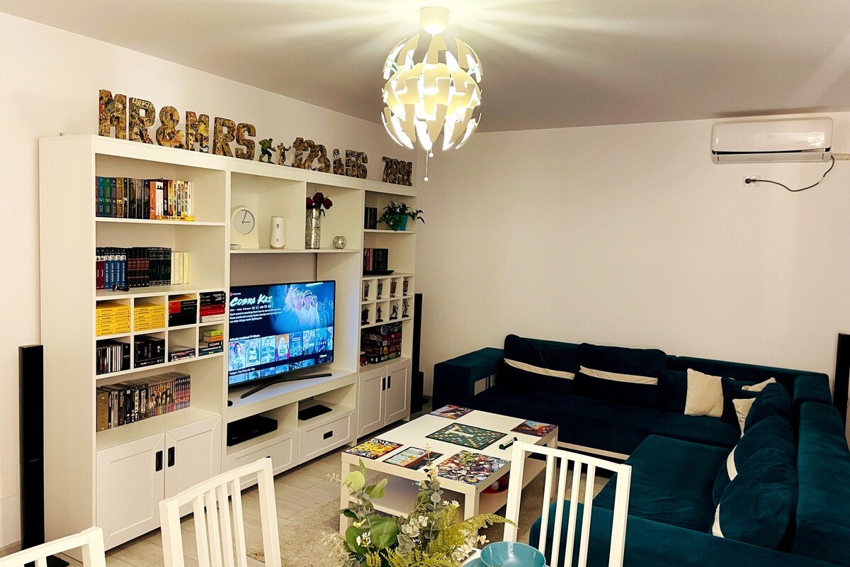 Doživite udobnost u našem 2BR modernom i elegantnom stanu (90 m2), dizajniranom da se osjećate kao kod kuće, savršenom utočištu za parove, grupe ili porodice od 6 + 1 beba (dječji krevetić). Naš stan se nalazi u mirnoj stambenoj četvrti i udaljen je samo 25 minuta automobilom ili metroom do Starog grada, pružajući savršenu ravnotežu između mira i pristupačnosti. Veliki TV s 5.1 surround sistemom, bračnim krevetima, potpuno opremljenom kuhinjom. Besplatan parking, prodavnice, restorani, apoteke, brijačnica, sve u krugu od 2 minute hoda.