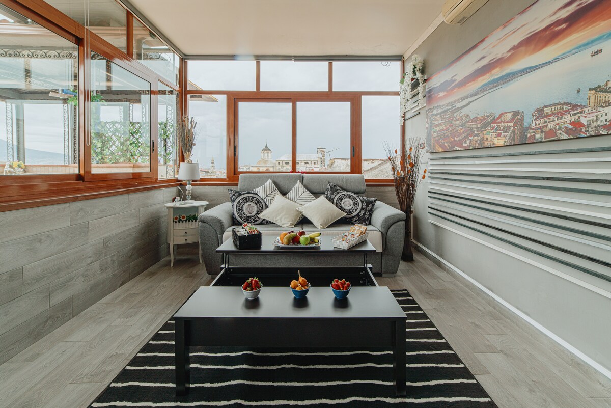 Attico nel quartiere Chiaia,palazzo signorile anni '40 con ascensore in legno.Parcheggio gratuito non assegnato.Raggiungibili a piedi la cumana al Corso Vittorio Emanuele e la metropolitana in Piazza Amedeo. Il panorama vi farà innamorare la vista è sull'intero golfo:Vesuvio,Sorrento,Capri,Mergellina,Posillipo.L'appartamento è silenzioso,luminosissimo,gode di tutte le comodità:internet,tv,aria condizionata,terrazzo arredato con tavolo,barbecue,dondolo,angolo fitness con tappeto professionale.