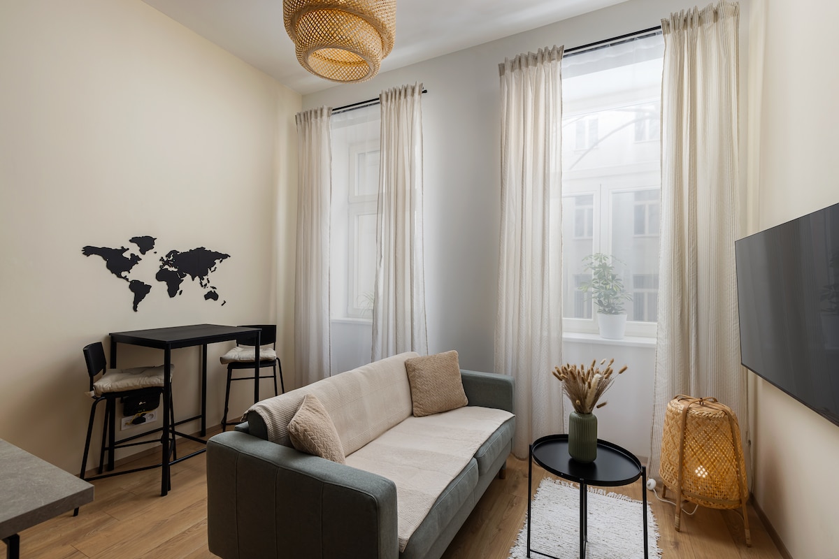 Nudimo udoban stan u blizini centra u historijskoj zgradi koja je u potpunosti obnovljena. „Pronađite svoj drugi dom.” Željeli smo stvoriti smještaj koji bi pružio maksimalnu udobnost za opuštanje nakon istraživanja grada. Udaljen je samo nekoliko minuta od centra Praga, nedaleko od tramvajske stanice, glavne željezničke stanice i metroa. Dostupni su moderna, potpuno opremljena kuhinja i Smart TV s brzom Wi-Fi vezom.