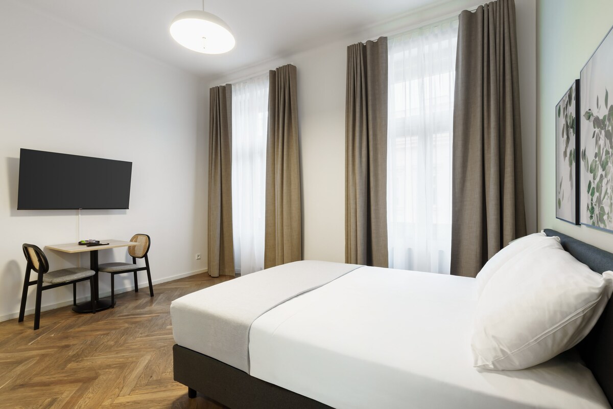 A lovely hotel room with a bathroom and a view of a quiet courtyard. Working desk. Free Wi-Fi. TV. The renovation took place in 2024. Quiet neighborhood within walking distance of historical monuments (800 meters Wenceslas Square). Shops, cafes, cinemas, parks nearby. Please note that city tax 2,2€/pers./night is to be paid upon arrival.