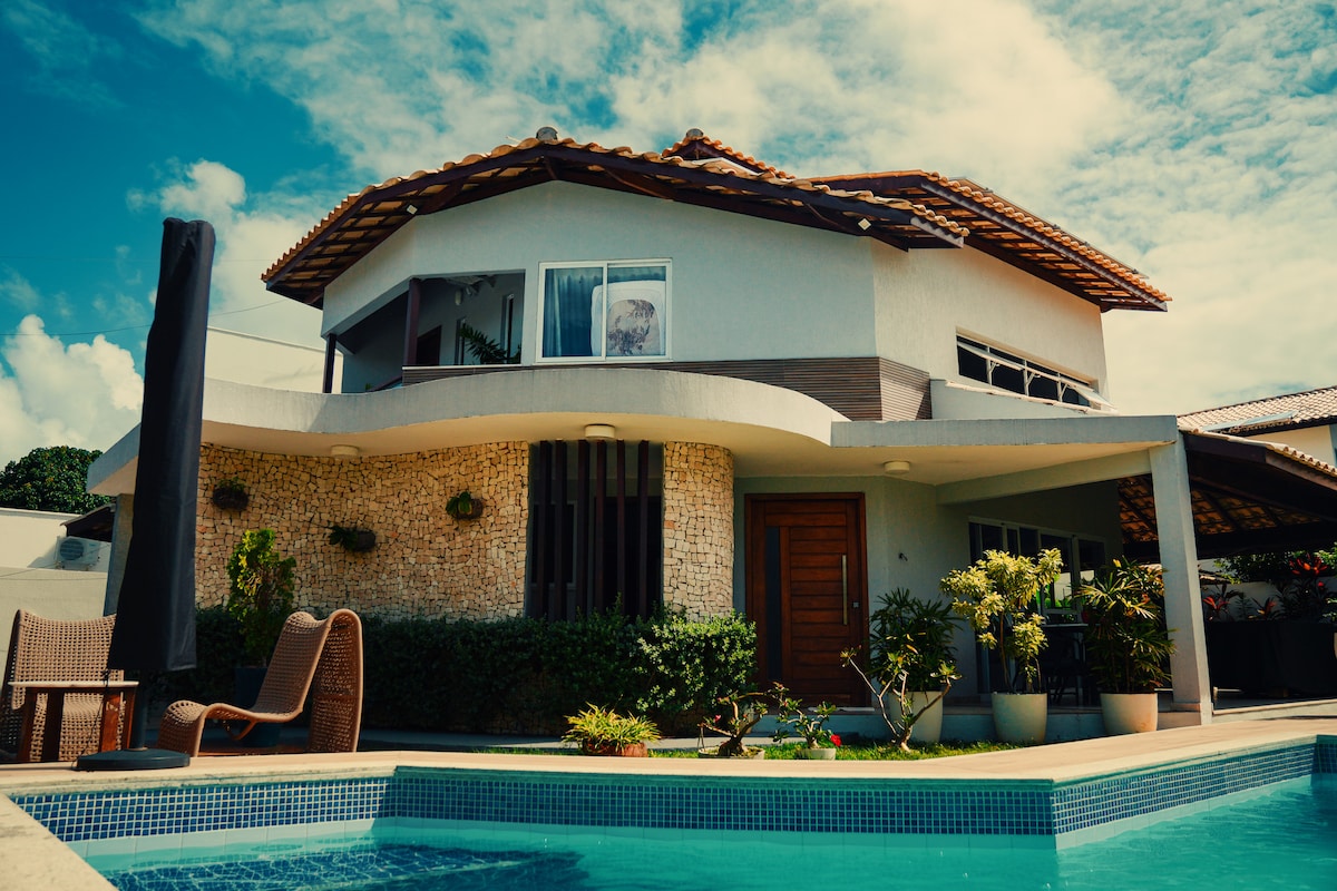 Elegantna kuća 5 klimatizovanih apartmana, bazen i prostor za gurmane •Roštilj/IWi Fi • Cyclovia s pogledom na okean, sportski teren/Dječji park • Bicikli dostupni za korištenje gostima • Posteljinu /peškire Ovo je idealan izbor za porodice i grupe koje traže udobnost, Uživajte u nevjerovatnim danima, smještenim samo 3 minute hoda od najbolje plaže u Guarajubi, u ograđenom stanu s 24-satnim osiguranjem. Maksimalno 12 osoba
