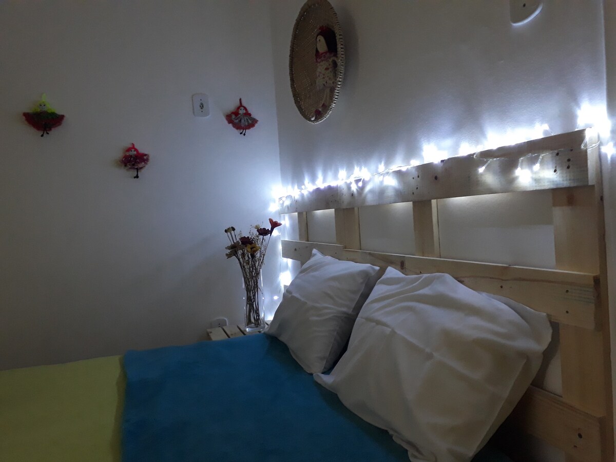Acomodação com 5 m2, uma cama box de solteiro. Ventilador. Rouparia completa.