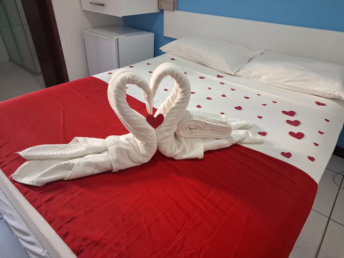 Suíte com 12 m2, uma cama box de casal. Banheiro privativo com ducha quente e ducha higiênica. TV LED Smart. Frigobar. Ar condicionado Split. Rouparia completa e cortina black out.