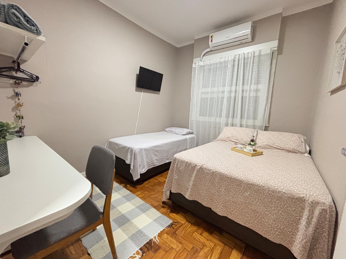 Esquina da Praia do Leme Posto1, pored Mercado Zona Sul 24HS, apoteke, restorani, 5 min Shopping Rio Sul. DNEVNI BORAVAK 2 bračna kauča na razvlačenje, sto sa 4 sjedišta, TVSmart, MREŽA, Wi-Fi, 2 ventilatora; KUHINJSKI aparat za kafu, aparat za sendviče, friteza,mikrovalna pećnica, električni štednjak, aparat za kafu, blender, frižider i pribor; SPAVAĆA SOBA 1 bračni krevet, 1 krevet za jednu osobu, ormarići, klima-uređaj, posteljina/KUPATILO; električni tuš u kupatilu, fen za kosu; Tiho, prozračno, recepcionar 0-24, društveni lift i usluga.