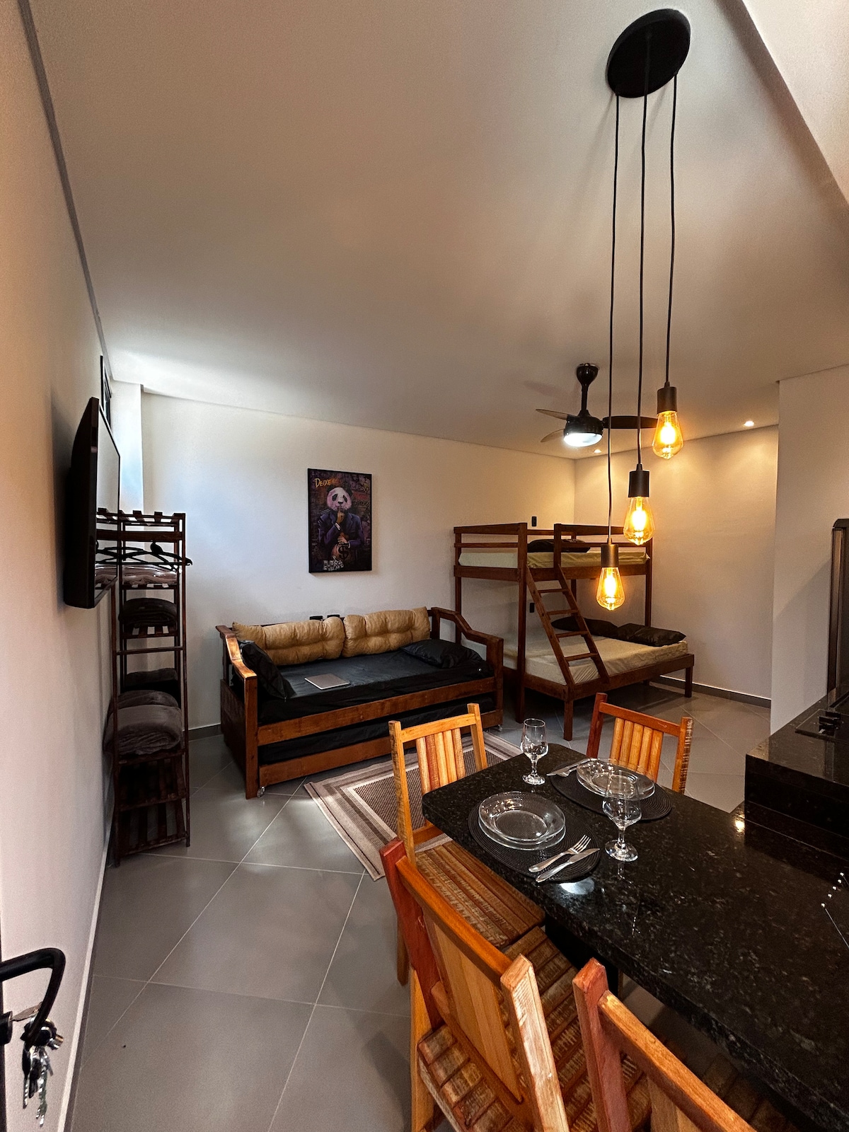 Novi studio s dizajnom koji je potpisao arhitekta, vrlo lijep i udoban. Udaljen je 400 metara od Orla da Praia do Perequê Açú. Imamo: pametni TV, svjetlovodni Wi-Fi, vlastiti prostor za rad, opremljenu kuhinju, roštilj na balkonu i prekrasan pogled na Atlantsku šumu. U zgradi imamo bazen, rernu za pizzu, tuš i garažu s elektronskom kapijom. Nalazi se na vrlo dobroj lokaciji, u blizini ulice Centro e Rua Turística, pored autoputa.