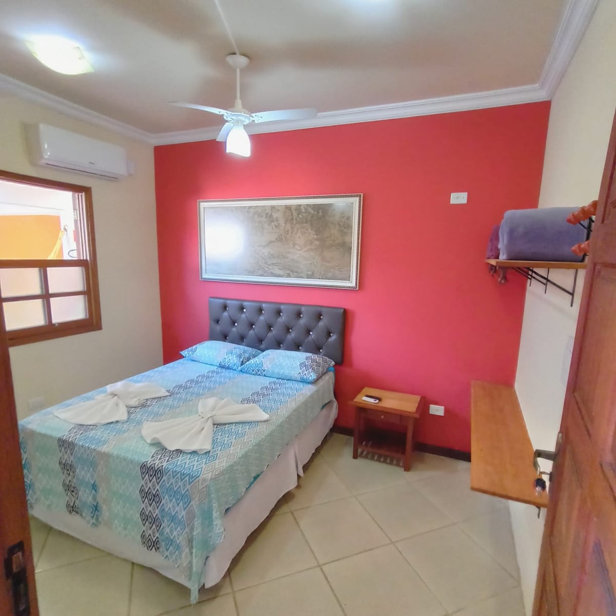 A suíte possui cama de casal com forro de elástico, uma manta fina, e travesseiros com fronhas. A suíte não possui vista direta para o mar mas você consegue ver o mar no nosso deck que fica de frente à praia. O Ar condicionado, ventilador, frigobar, TV e banheiro privativo estão disponíveis para seu conforto. Além disso, são fornecidas duas toalhas de banho. Esta suíte não fica localizada na parte próxima à praia ou deck e sim no primeiro ou segundo prédio no meio ou começo do quintal.