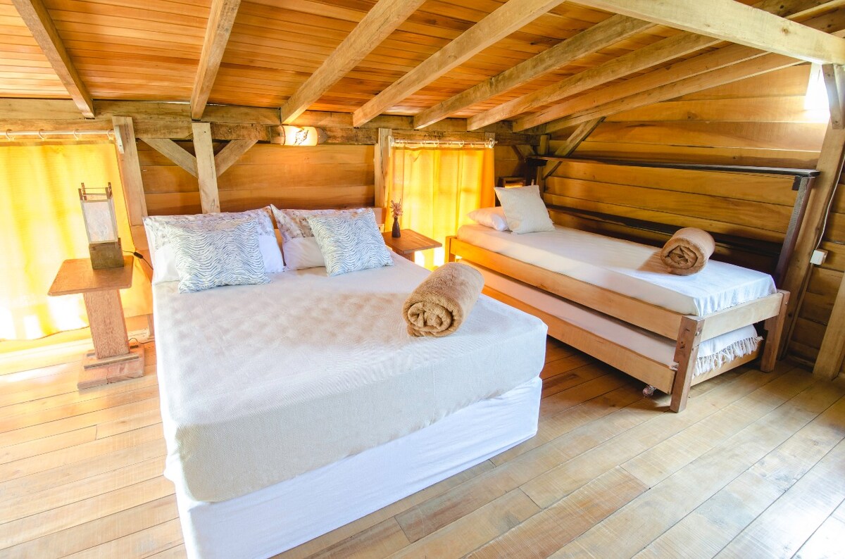 As Suítes Deluxes, ficam localizadas no piso superior, com acesso por escada. Com uma Varanda única e uma vista linda da natureza e dos animais. As suítes são inteiras em madeira, com pé direito alto proporcionando assim uma amplitude maior no ambiente. Para o seu maior conforto nosso Ar Condicionado é Quente e Frio assim em qualquer época do ano sua estadia fica agradável. Para essa acomodação não aceitamos Pet. Nosso delicioso Café da Manhã está incluso em sua diária.