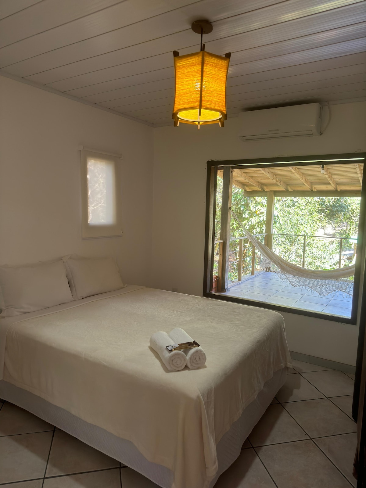 Izuzetno udobna brvnara u Rosa Norteu, idealna za 2 osobe. Obezbijedili smo posteljinu, peškire, stolice za plažu, kompletnu kuhinju, aparat za kafu, toster, minibar i sve ostalo posuđe. Ima hladan klima-uređaj i individualni roštilj na balkonu. Plaža 900m ( Putem, u blizini brvnare koja odlazi na Rosa Norte +/-15Min hoda) , Centrinho 950m . Lagoa 1.500m Tržnica, apoteka, prodavnice na 200m,