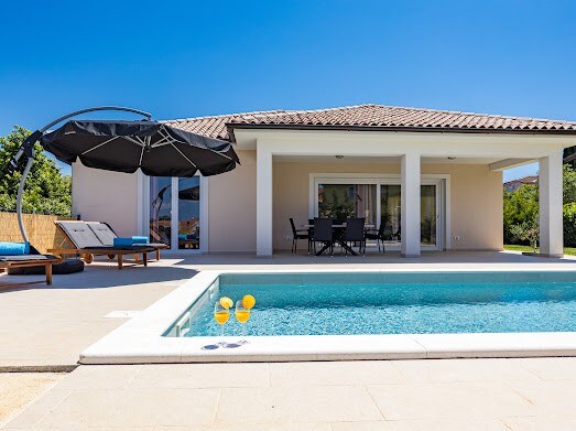 Tražite mir i blizinu grada i aktivan odmor? Onda smo pravi izbor za vas! Nalazi se u blizini grada Pule u mirnom okruženju Valdebeka. Nova moderna kuća s vlastitim dvorištem,bazenom, jacuzzijem,dječjim igralištem u hladu maslina bit će vaša oaza. Na prvom spratu kuće nalaze se tri spavaće sobe s privatnim kupatilima,a na prvom spratu se nalazi dnevni boravak s kuhinjom,trpezarijom i malim WC-om. Budite naši dragi gosti i opustite se sa porodicom i prijateljima u našem udobnom smještaju