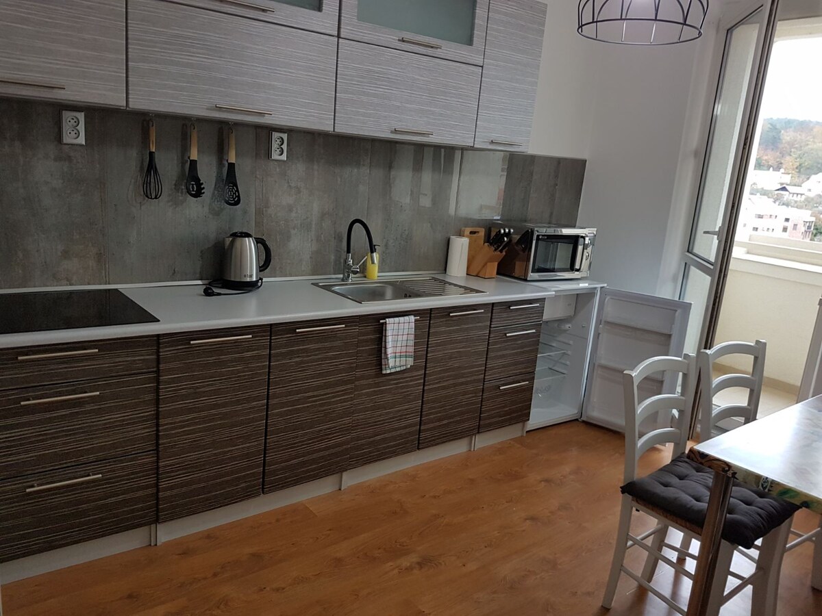 Stan s 2 spavaće sobe s bračnim krevetom i 2 kreveta za jednu osobu s opcijom za 5. osobu s krevetom na razvlačenje. Nedavno renovirana s potpuno opremljenom kuhinjom i balkonom. Prostrana dnevna soba. Brzi Wi-Fi i TV. Strogo stan u kojem se ne puši. Udaljenost od autobuske stanice i trgovine prehrambenih proizvoda. Igralište za vrste odmah ispod balkona.