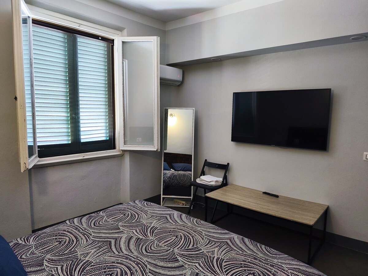 A spacious room with a private bathroom, kitchen, terrace, air condition and wi-fi, furnished with a king-size bed and a sofa bed.