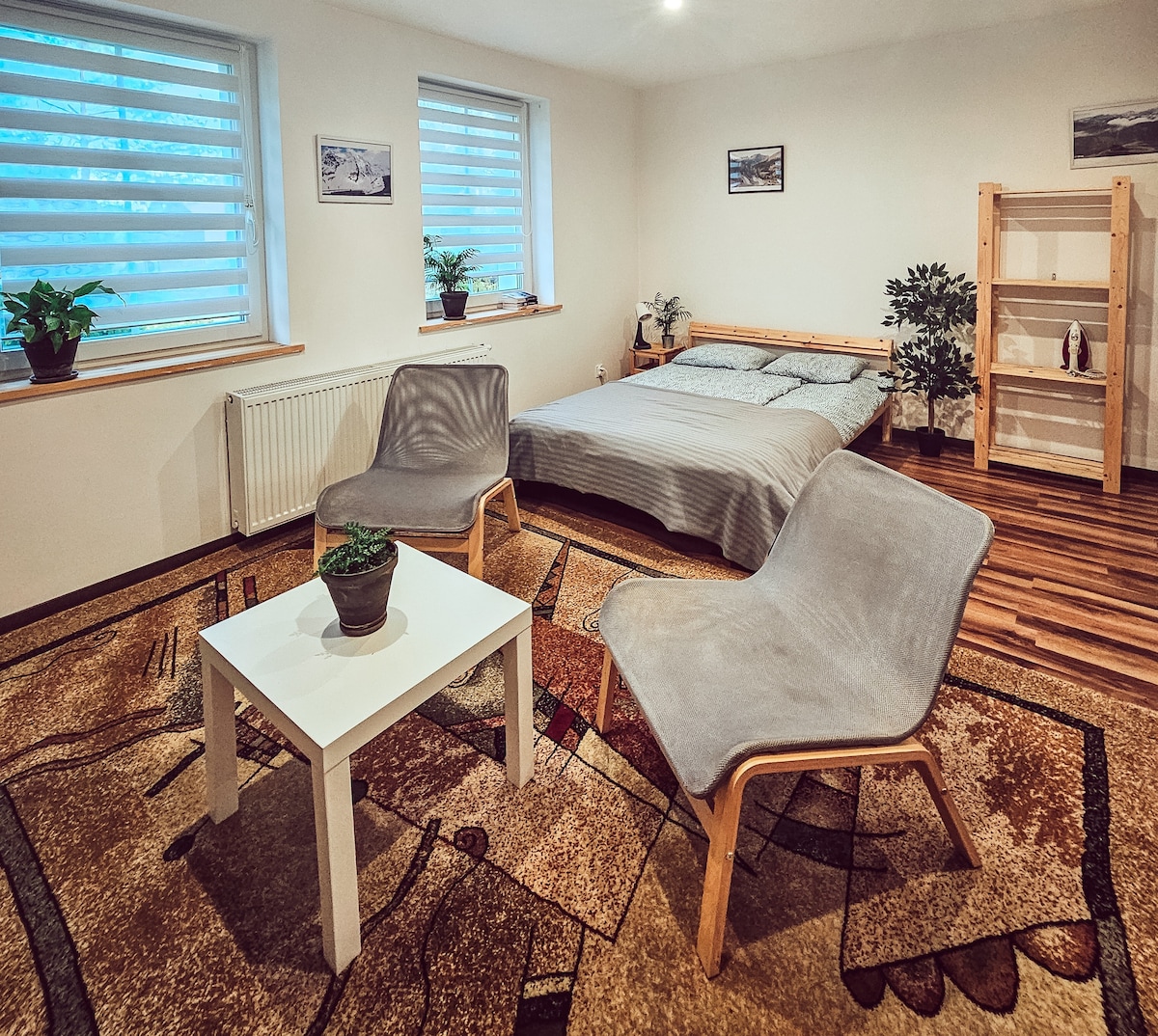 Nowoczesny apartament w cichej, zielonej okolicy, zaledwie kilka minut od autostrady. Idealny dla podróżujących służbowo i turystów. Do dyspozycji gości: przestronny salon z kuchnią i jadalnią (również jako miejsce noclegowe), sypialnia z łóżkiem małżeńskim, pokój jednoosobowy, łazienka z wanną i prysznicem, duży balkon. Apartament na 1. piętrze, z osobnym wejściem i miejscem parkingowym na 2 auta.