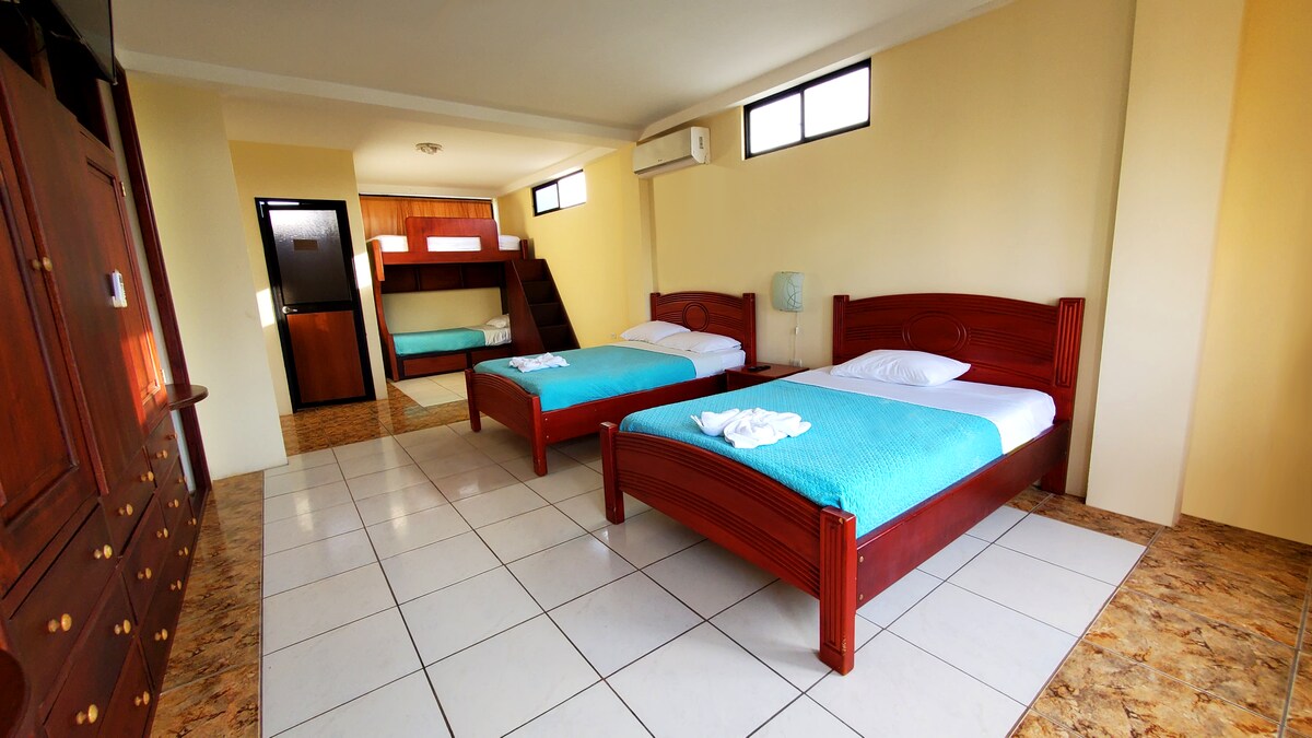 Habitación en segunda planta. La habitación cuenta con 2 camas Queen, aire acondicionado, baño privado con agua caliente y secador de cabello. Disfruta de nuestra piscina luego de tus actividades turísticas. Te brindamos agua filtrada, te y café Galapagueño free 24 horas, disponible cundo lo necesites. Nuestras tarifas no incluyen 15% IVA, por favor si eres de ECUADOR y requieres Factura comunícate con nosotros antes de confirmar tu reserva.
