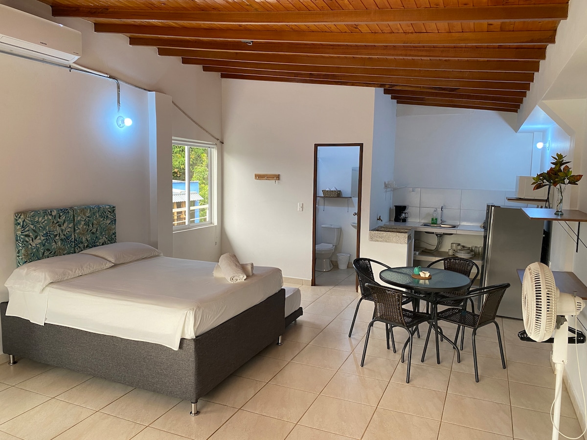 Opustite se na ovom jedinstvenom i mirnom odmoru. Smješten u kolumbijskom Santoriniju, čarobnom mjestu koje vas vodi na grčke otoke, sa svojim popločanim uličicama i bijelim fasadama ispunjenim prekrasnim vrtovima čine da se osjećate kao da ste u Evropi. Privatni parking, klima-uređaj, Wi-Fi i kablovska TV upotpunjuju vaš odmor. Nekoliko metara od restorana i spektakularnog trga u četvrti La Aldea