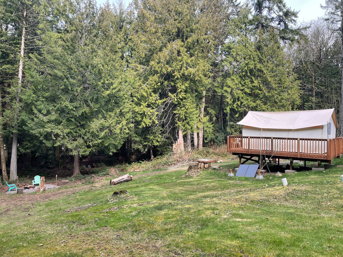 Šator od platna izvan mreže, postavljen na pašnjaku za konje na našoj višegeneracijskoj porodičnoj farmi od 23 hektara. Skrovito, rustikalno, tiho i mirno, ovo mjesto za glampovanje je spremno za vas da dođete i opustite se. Šator ima bračni krevet, unutrašnju peć, vanjsko ognjište i roštilj za kuhanje, a šetnja kroz šumu vodi do vilinske doline! Trenutno nema struje ni tekuće vode, ali su dostupni pitka voda i baterije. 25 minuta od aerodroma, 30 minuta do Seattlea i Puget Sounda!