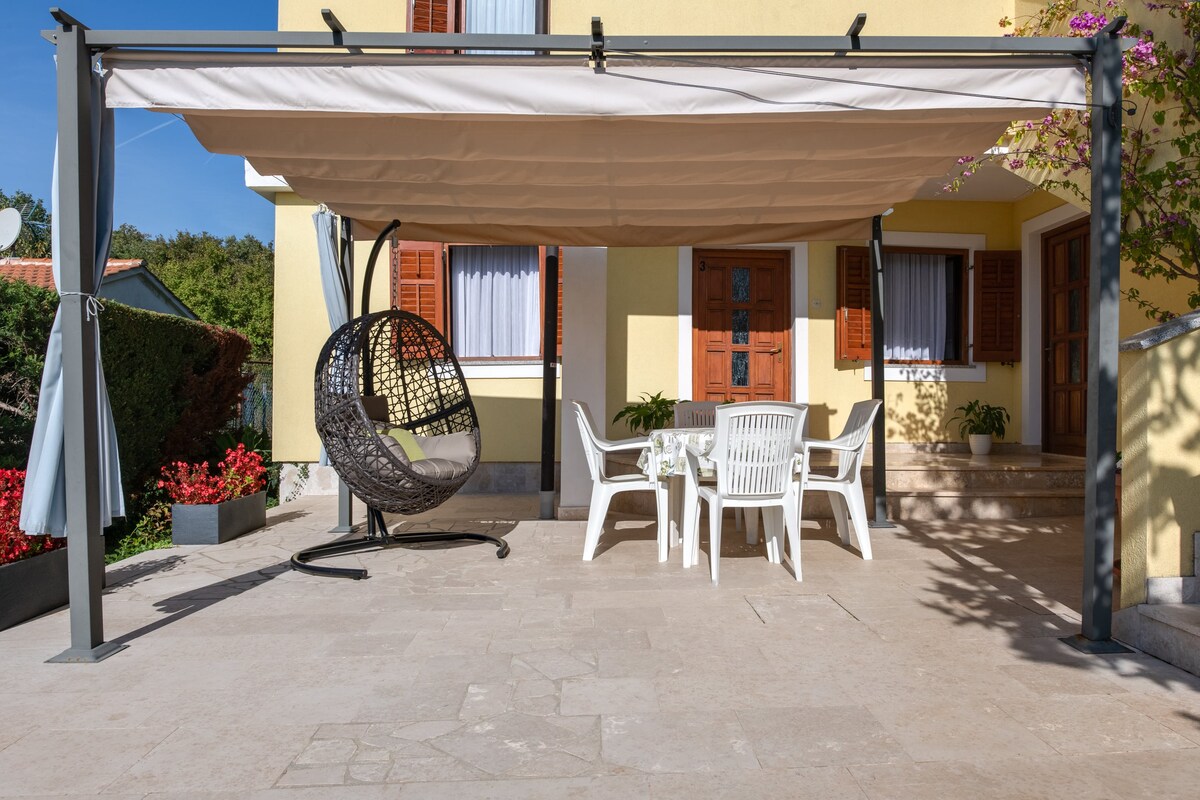 moderno potpuno opremljeni apartman sa lijepim pogledom na more i kvarnerske otoke, smiješten na prvom katu i zasebnim ulazom sa velikom terasom od 60 Ovaj se apartman nalazi u obiteljskoj kući i ima pogled na more.Udaljen je 800 m od šljunčane plaže, i 400 m od centra . Smještajna jedinica ima potpuno opremljenu kuhinju, SAT i besplatni Wi fi,apartman je aklimatiziran ali se korištenje klime plaća naknada po satu 1 € po korištenju (climacard)Besplatni parking u blizini ili na ulici.