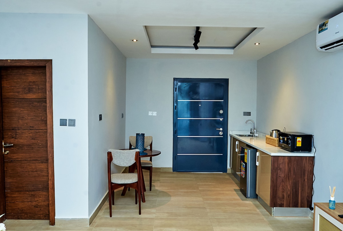 Prostran i potpuno namješten stan s 2 spavaće sobe i 2 kupatila; velika funkcionalna kuhinja. Sadržaji uključuju mašinu za pranje veša, kablovsku televiziju (DSTV), internet (Vodafone) i stojeći generator. Smješten u mirnoj, ali lako dostupnoj ulici (Golf Street) u kvartu Achimota pored Achimota Golf kluba, i kratkim prevozom do Univerziteta u Gani, Legon, GIMPA i 15 minuta od Međunarodnog aerodroma Kotoka. Obližnji Achimota Mall nudi sve pogodno iskustvo kupovine