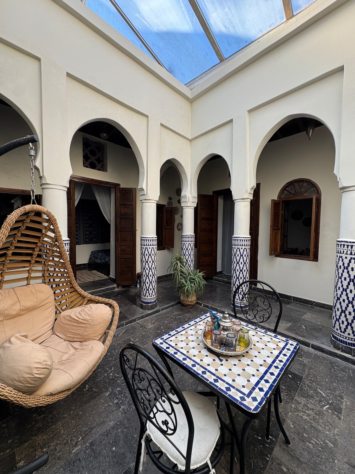 Skriveno blago u srcu Medine u Rabatu u Maroku. Svježe renoviran 2024. godine, naš Riad kombinuje tradicionalni šarm i savremenu eleganciju. Sa 7 izuzetnih spavaćih soba, marokanskom dnevnom sobom, kuhinjom i terasom s prekrasnim pogledom na Medinu, svaki boravak obećava nezaboravan doživljaj. Smješten u mirnoj uličici, naš Rijad je savršeno mjesto da doživite svu čaroliju Rabata, dok uživate u neuporedivom utočištu mira.