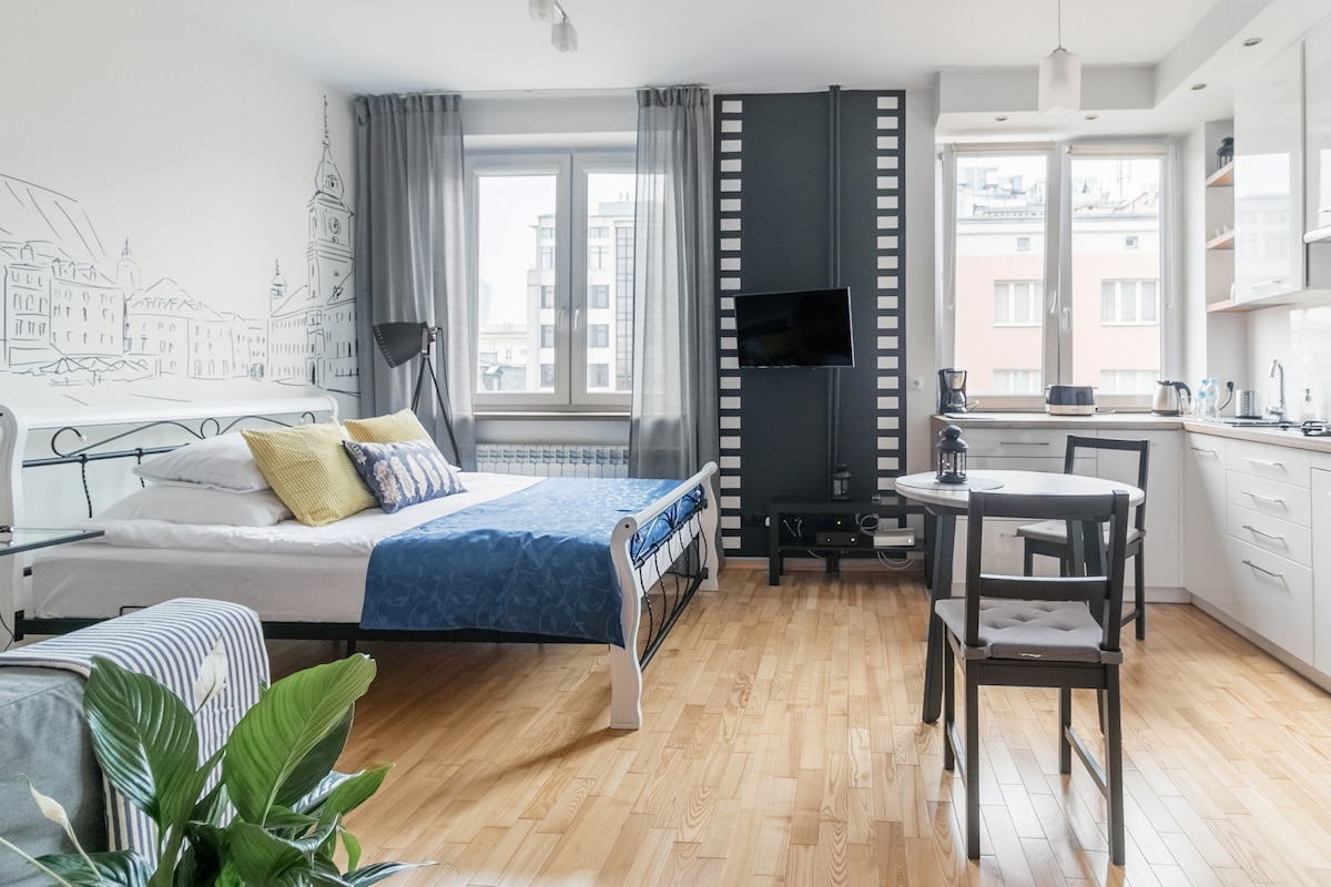 Novouređeni, moderni, centralni i udobni stan za savršenu kombinaciju posla/života i zabave. Stan od 47 m2 ima direktan pogled na Varšavski horizont i sastoji se od: dnevnog boravka s radnom stanicom (uključujući najbrži Wi-Fi), kao i kauča na izvlačenje s funkcijom spavanja, kuhinje s trpezarijskim stolom, spavaće sobe, kupatila s tušem. Stan je funkcionalno namješten i opremljen potrebnim uređajima. Vrlo dobra povezanost javnim prevozom i 15-25 minuta do grada/aerodroma.