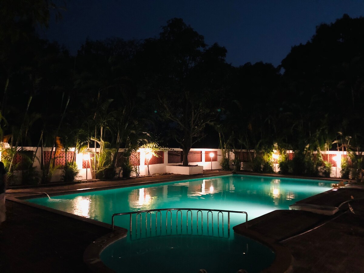 MTDC licencirana 3BHk vila nedavno renovirana ima svoj privatni bazen s kišnim tušem , uređeni vrt od 2000 kvadratnih metara pored prednje verande od 500 kvadratnih metara i istaknute vanjske restorane pored bazena Vanjski prostor je dovoljan za uživanje u roštilju i večeri dok se kupate u bazenu. Kuhinja je opremljena kućanskim aparatima i posuđem, što vam omogućava da sami pripremite obrok ili da ga dogovorite putem naših dežurnih kuhara. 3Ac spavaće sobe, 5 kupatila , hodnik i trpezarija s TV-om i muzičkim sistemima su postavljeni.