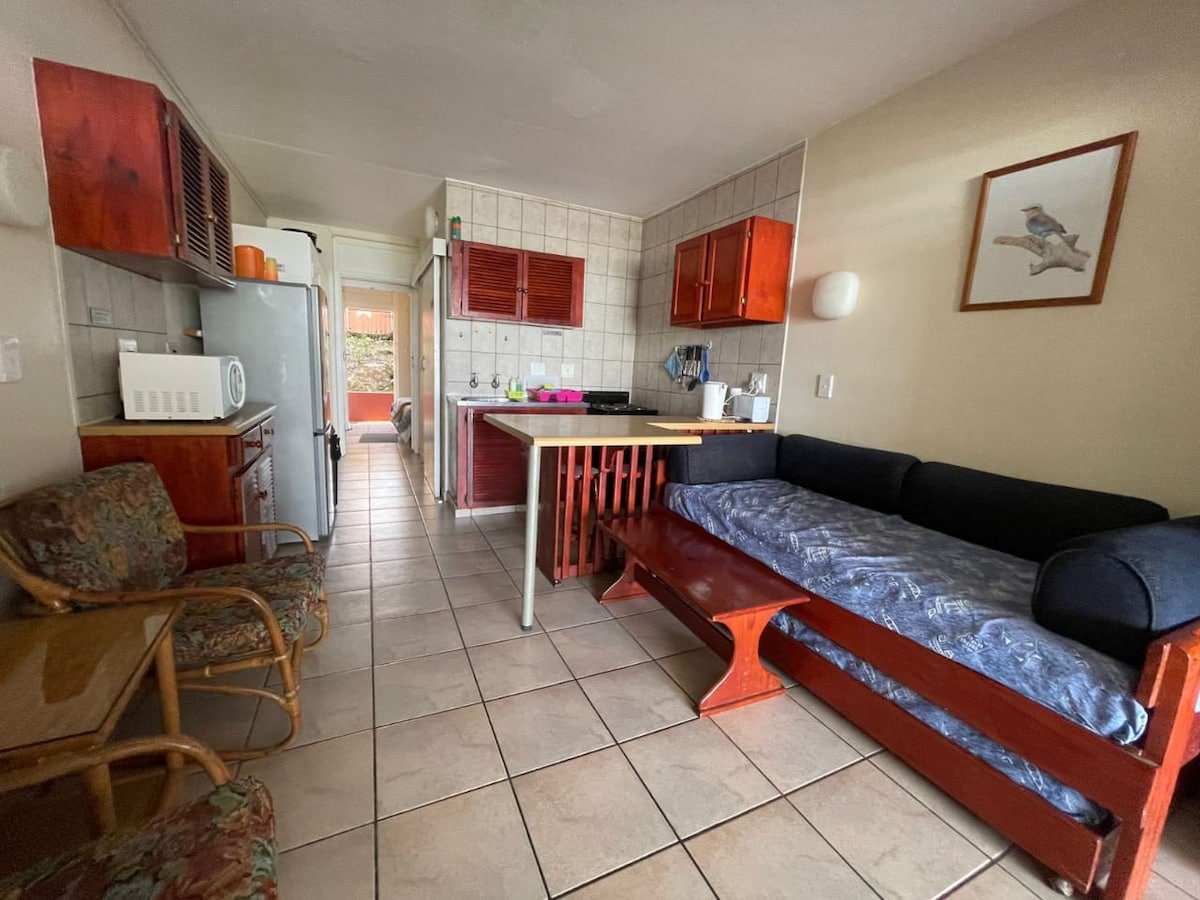Seoska kućica ispod naše kuće s malom kuhinjskom spavaćom sobom i kupatilom. To je jedinica za samostalno snabdijevanje s frižiderom, mikrotalasnom rernom i šporetom sa rernom i kuhinjskim priborom za jelo i priborom. Imamo dva mala psa, Yorkie i Jacka Russella. Postoji braai objekat i veliki bazen. TV i Wi-Fi su dostupni. Kuća je okružena prekrasnim tropskim vrtom i mirna je i tiha. Udaljeni smo oko 1000 metara od najbliže plaže. Dostupan je otvoreni parking. Bebe i djeca su dozvoljeni.