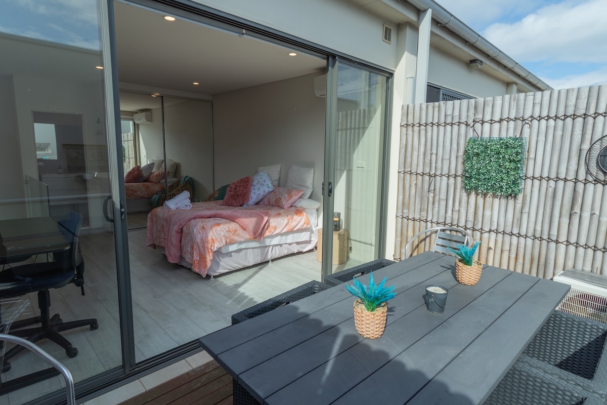Otkrijte ovaj moderni dvokrevetni smještaj s 2 kupatila u mirnoj ulici s drvoredima u porodičnom kvartu; 15 minuta do plaže, 5 minuta do udobnog kafića. Opustite se u privatnoj masažnoj kadi pod vilinskim svjetlima, kuhajte u dizajnerskoj mramornoj kuhinji ili se opustite u dnevnom boravku s klima-uređajem s plišanim sjedalima. Uživajte u bračnim krevetima, kadama, filtriranoj vodi i terasi s roštiljem. Pozajmite besplatnu stolicu za longboard/plažu za zabavu uz more. Uključuje mjesto za automobil i terasu za sunčanje na balkonu savršenom za sunčanje ili pogled na zalazak sunca.