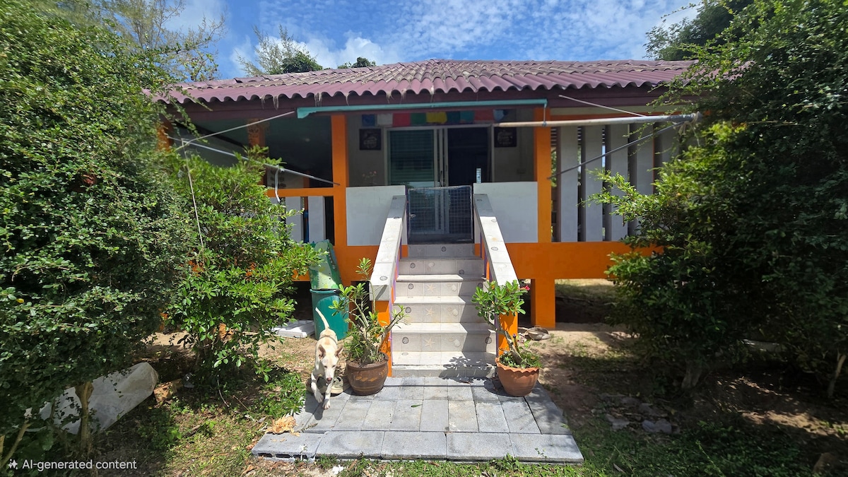 .My house is a cozy single-story home surrounded by greenery and nature. It is located in a peaceful area near the beach, offering a calm and relaxing atmosphere. The house is slightly elevated with a small staircase leading to the entrance.