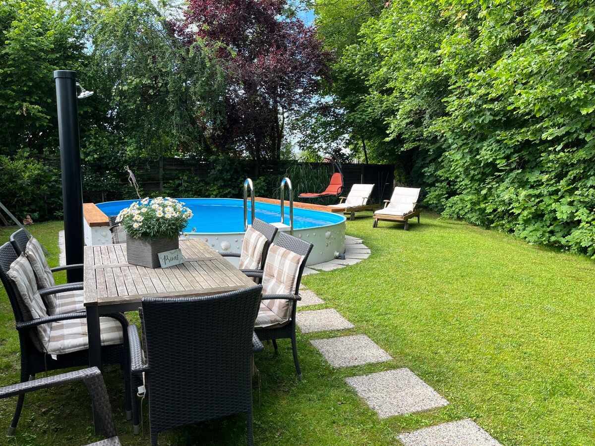 Unser Haus liegt sehr ruhig am Waldrand . Zum Haus gehört ein großer Garten mit Gartenteich. Wir bieten eine gut ausgestattete Küche, ein Schlafzimmer mit Balkon zum Garten, ein Wohnzimmer mit zwei Einzelbetten, beide Zimmer sind mit TV ,ausgestattet, ein Bad und eine große Loggia. Hier laden gemütliche Sitzplätze und eine Hängematte zum Entspannen ein. Parkplatz direkt vor der Haustür Innradweg ,und Erholungsgebiet unterer Inn in der Nähe. Übernachtungspreis bezieht sich auf zwei Personen.