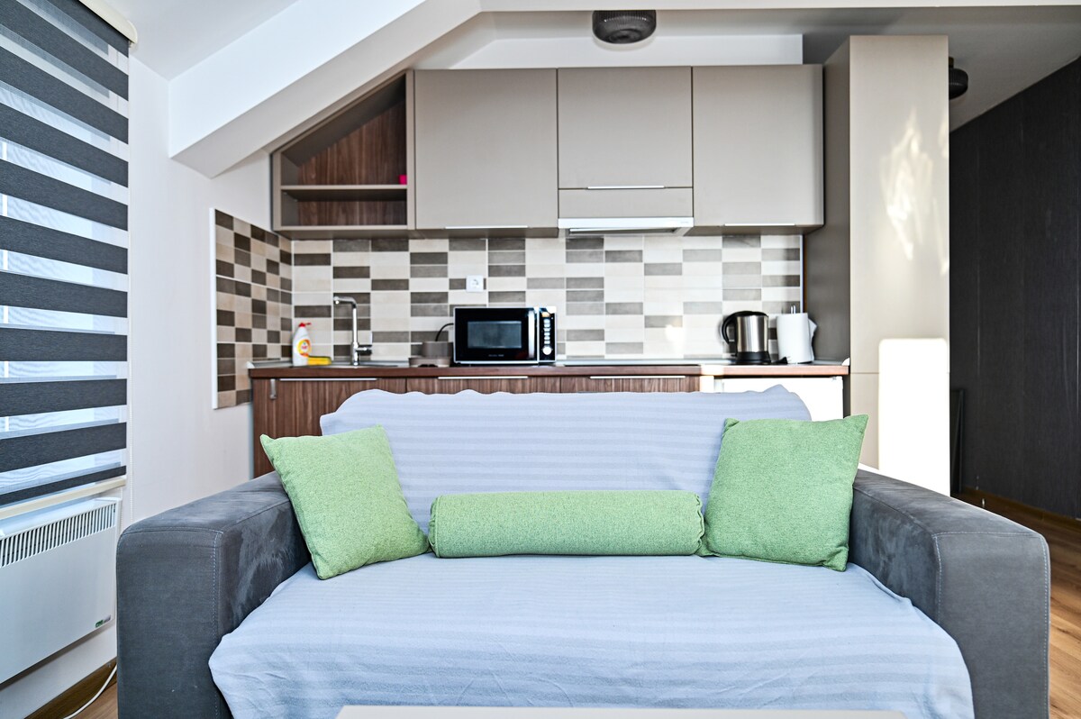 Udoban jednosobni stan u Milmari Resortu, Kopaonik. Može spavati do 4 osobe, s romantičnim pogledom na balkon. Uživajte u spa centrima sa saunama, unutrašnjim/vanjskim bazenima (uz dodatnu naknadu). Samo 3 km do skijališta i 6 km do centra Kopaonika; dostupno automobilom ili zimskim prevozom. Idealno za parove ili porodice. Uključen je besplatan parking u garaži. Savršeno za udoban planinski odmor s udobnošću, pogledom i wellnessom u blizini.